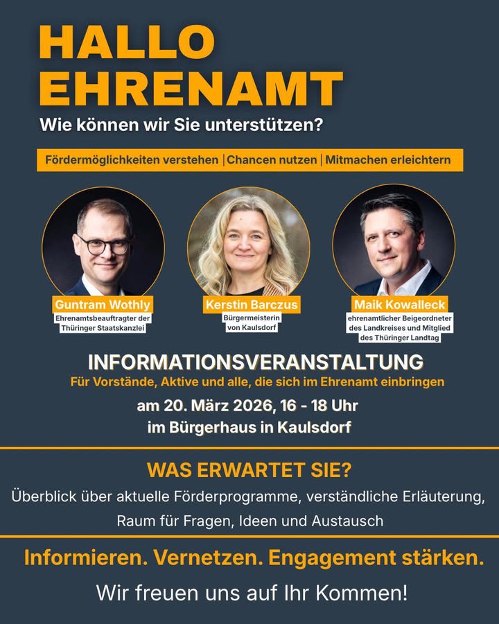 📣 Hallo Ehrenamt ? Wir unterstützen Sie!Am 20. März 2026 steht im Bürgerhaus Kaulsdorf das Ehrenamt im Mittelpunkt. Von 16 bis 18 Uhr sind alle Engagierten, Vereinsvorstände und Interessierten herzlich zur Informationsveranstaltung eingeladen.Gemeinsam mit dem Ehrenamtsbeauftragten der Thüringer Staatskanzlei, Guntram Wothly, sowie der Kaulsdorfer Bürgermeisterin, Kerstin Barczus, informieren kompetente Ansprechpartner über aktuelle Fördermöglichkeiten für Vereine und Initiativen ? verständlich, praxisnah und unkompliziert.Was erwartet die Gäste?✔️ Überblick über Förderprogramme und Unterstützungsmöglichkeiten✔️ Praxisnahe Erläuterungen✔️ Raum für Fragen, Austausch und VernetzungOb Feuerwehr, Sportverein, Jugendclub, Kultur- oder Sozialprojekt ? ehrenamtliches Engagement ist das Herzstück einer lebendigen Gemeinschaft. Ziel der Veranstaltung ist es, konkrete Hilfestellungen zu geben und neue Impulse für die Vereinsarbeit zu setzen.📍 Bürgerhaus Kaulsdorf🗓️ Freitag, 20. März 2026🕓 16:00 ? 18:00 UhrDie Einladung darf gern geteilt werden ? interessierte Mitstreiterinnen und Mitstreiter sind herzlich willkommen!