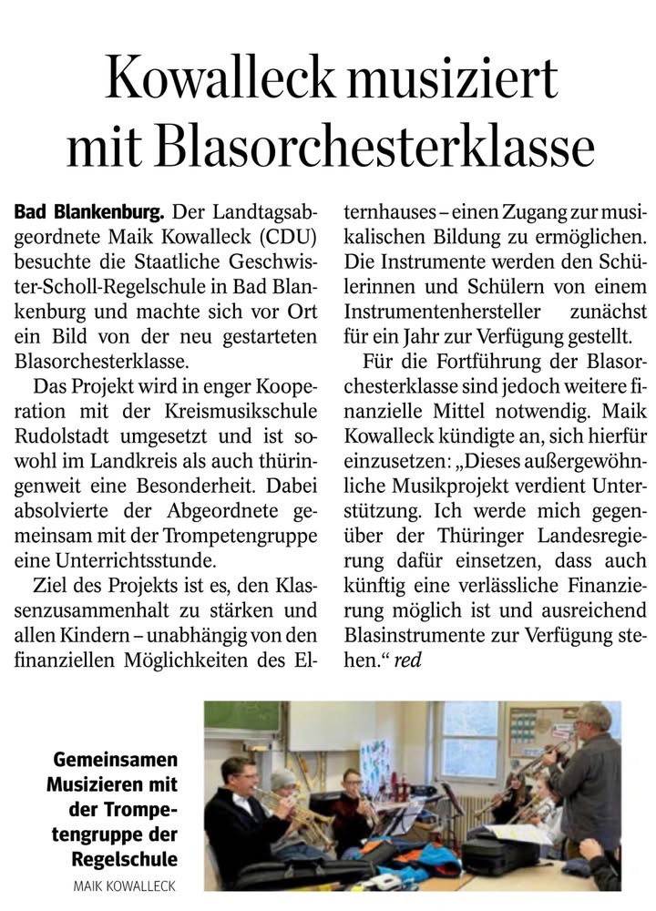 Von meinem Besuch in der Blasorchesterklasse in Bad Blankenburg berichtete am Freitag die OTZ Saalfeld | Rudolstadt. Das gemeinsame Musizieren hat mir sehr viel Spaß gemacht, und das Projekt verdient auf jeden Fall meine volle Unterstützung. Den jungen Musikerinnen und Musikern wünsche ich weiterhin viel Erfolg! 🎶🎺👍