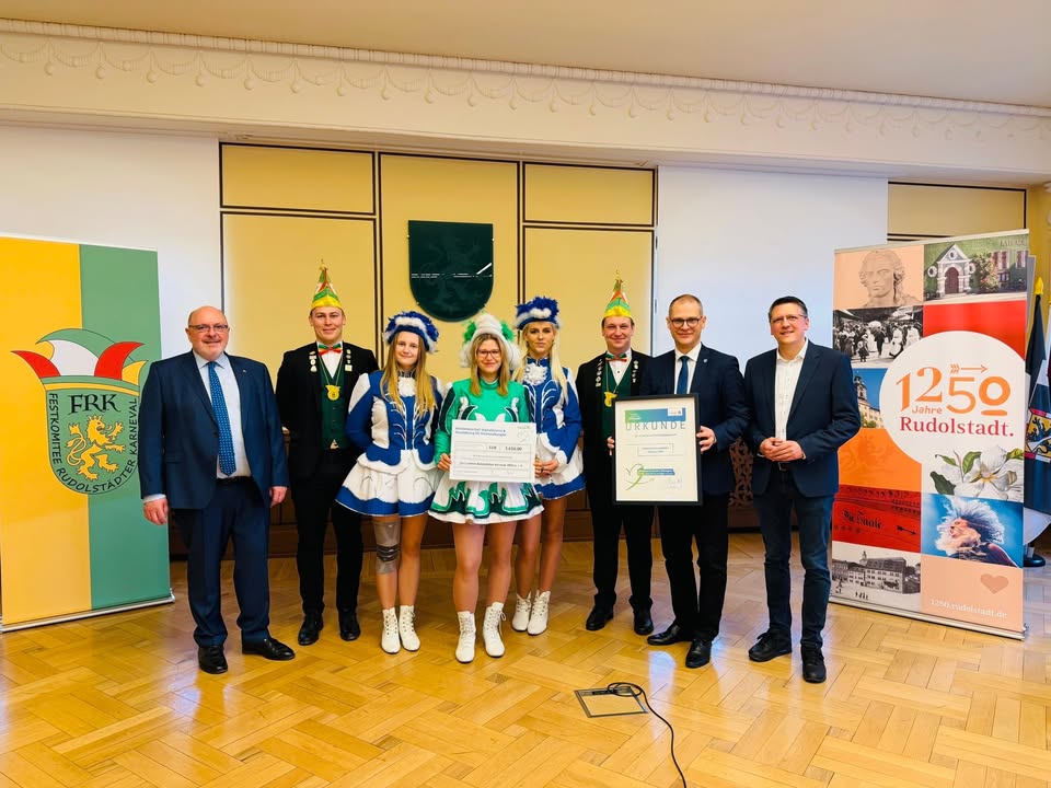 Das Festkomitee Rudolstädter Karneval erhielt am Mittwoch aus den Händen des Ehrenamtsbeauftragten der Thüringer Staatskanzlei, Guntram Wothly, die Förderurkunde für die Unterstützung der Vereinsarbeit. Gemeinsam mit Bürgermeister Jörg Reichl und Vereinsmitgliedern habe ich mich bei dieser Gelegenheit über die engagierte Arbeit der Karnevalisten und die aktuellen Veranstaltungstermine unterhalten. Die Freude über die Unterstützung des Freistaats Thüringen war groß und absolut verdient!