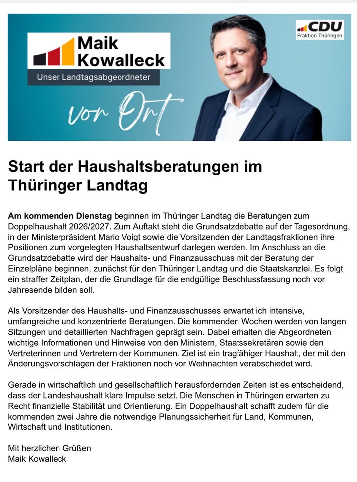 📊 Start der Haushaltsberatungen im Thüringer LandtagAm Dienstag starten wir im Thüringer Landtag mit den Beratungen zum Doppelhaushalt 2026/2027. Zum Auftakt steht die Grundsatzdebatte an ? mit den Wortmeldungen von Ministerpräsident Mario Voigt und den Fraktionsvorsitzenden zum Haushaltsentwurf der Landesregierung.Als Vorsitzender des Haushalts- und Finanzausschusses erwarte ich intensive und konzentrierte Beratungen in den kommenden Wochen. Es geht um Zahlen, Fakten und Verantwortung, aber vor allem darum, am Ende einen tragfähigen Haushalt zu verabschieden, der noch vor Weihnachten steht. Wir werden viele Stunden gemeinsam mit Ministern, Staatssekretären und Vertretern der Kommunen beraten. Dabei ist mir wichtig: Sachlichkeit, Transparenz und Planungssicherheit.Denn gerade in herausfordernden Zeiten braucht Thüringen einen verlässlichen finanziellen Rahmen. Ein solider Doppelhaushalt gibt Land, Kommunen, Wirtschaft und Institutionen die notwendige Orientierung für die nächsten zwei Jahre. 💼#Haushalt #CDU #Thüringen #Landtag #cduthüringen #PolitikFürThüringen #Finanzen #MaikKowalleck CDU Thüringen